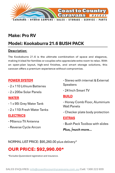 The Kookaburra 21.6 is the ultimate combination of space and elegance, making it ideal for families or couples who appreciate extra room to relax. With an open-plan layout, high-end finishes, and smart storage solutions, this caravan offers a premium experience without compromise.